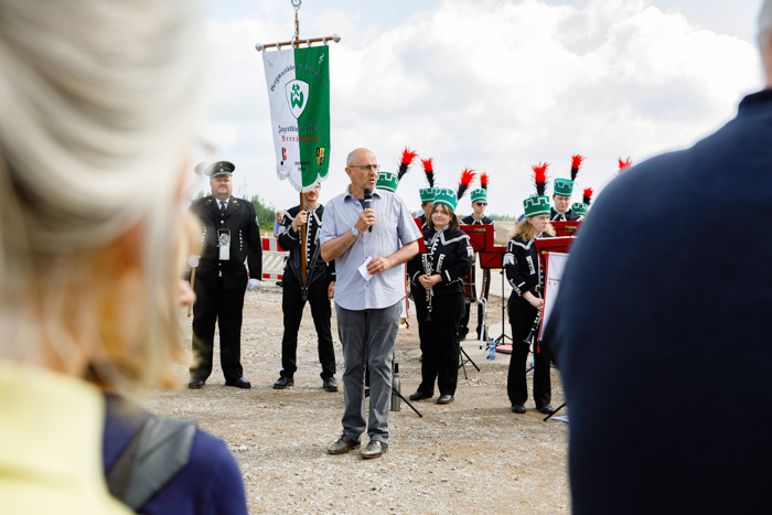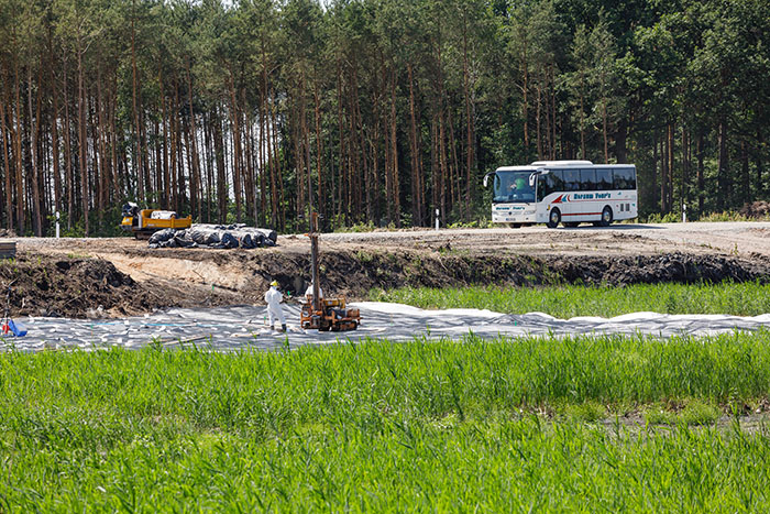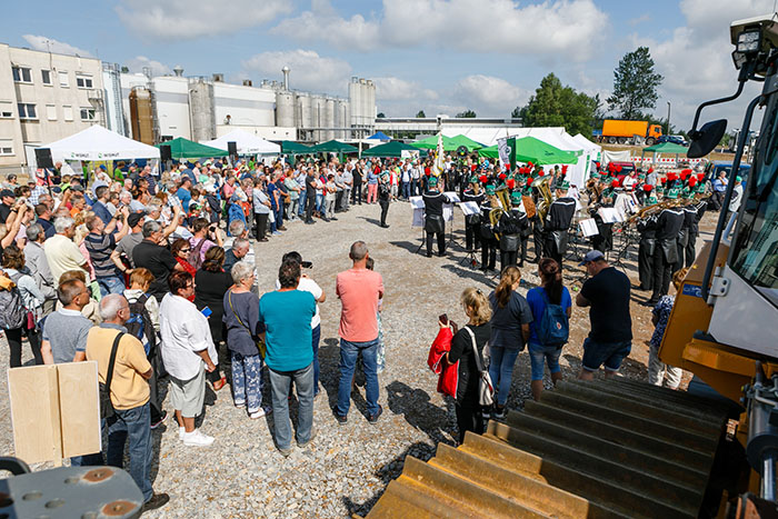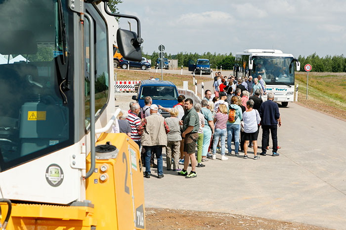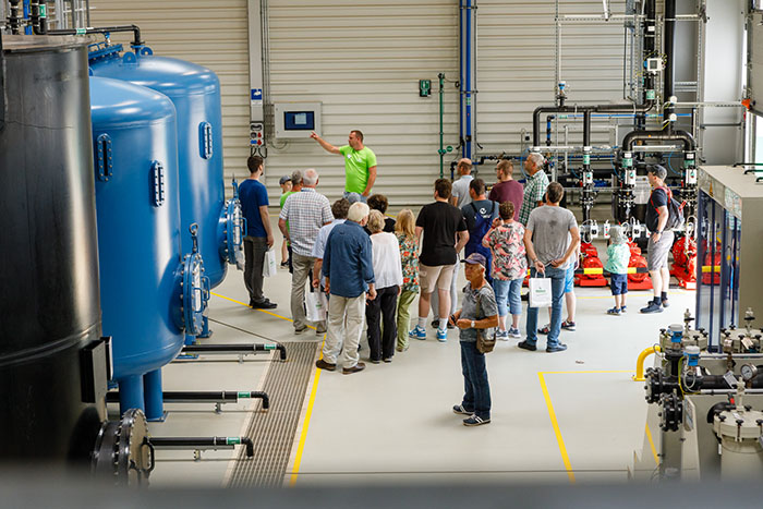 Dass von dem Schlammteich nichts mehr zu sehen ist, überraschte viele Gäste. "Wir fahren jeden Tag an dem Gelände vorbei und haben uns immer gefragt, wie es wohl hinter dem Damm aussieht", so eine Besucherin. Gleich nach der offiziellen Eröffnung durch Geschäftsführer Dr. Michael Paul bildeten sich lange Schlangen an den Haltestellen der Pendelbusse. Mehr als 800 Gäste führten fünf Kollegen durch die neue Wasserbehandlungsanlage und erklärten die Funktionsweise und Notwendigkeit der Wasserbehandlung. Wer bei den hohen Temperaturen nicht warten wollte, konnte sich bei den Kollegen und Kolleginnen vom Bereich Bohrung und Umweltmessung informieren oder sich die Technikausstellung auf dem Gelände vor der neuen Anlage ansehen.