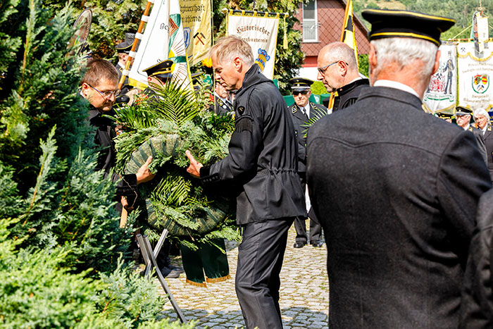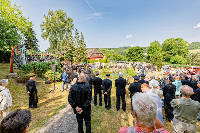 Wismut-Geschäftsführer Dr. Michael Paul, Bereichsleiter Andy Tauber und Abteilungsleiter Martin Zimmermann vertraten die Wismut GmbH und legten einen Kranz am Gedenkstein nieder. Dieser erinnert an die 33 beim größten Grubenunglück der Wismut am 15. Juli 1955 umgekommenen Bergkameraden.